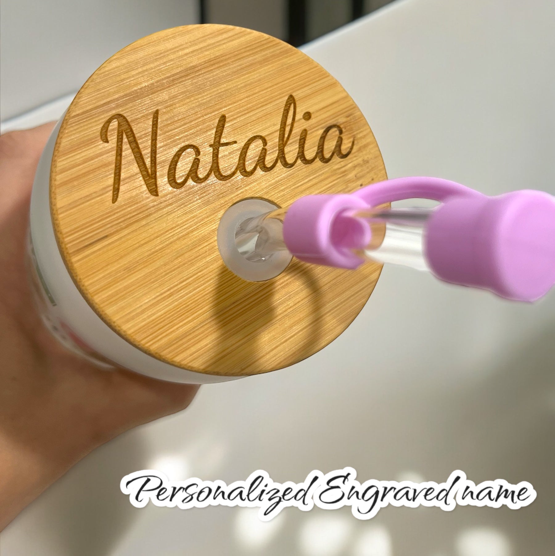 This adorable glass cup comes with engraved bamboo lid and glass straw with straw cover!